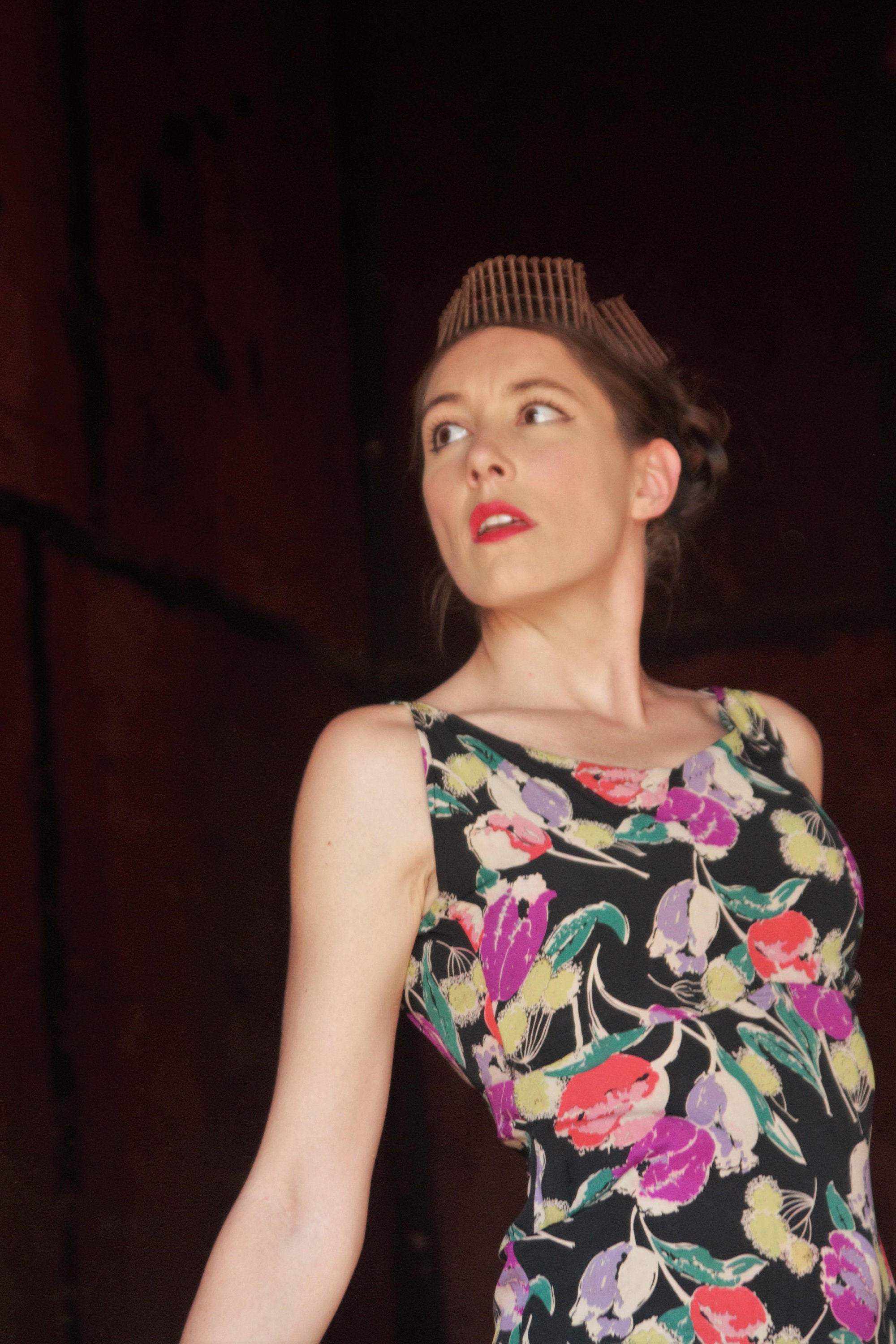 Design - This incredibly vivid 1930s gown comes to you in a brilliant, posterized tulip print on silk with a crimson, pink, dark teal green, chiffon yellow magenta, purple, ad cream white set against a midnight black background, making the really sing out. It features a low cut back with a scoop neck and is cut on the bias with a slight train and compressed row of ruffles along the bottom of the gown. A stand out piece that's full of vibrant elegance, art and form fitting flattery.