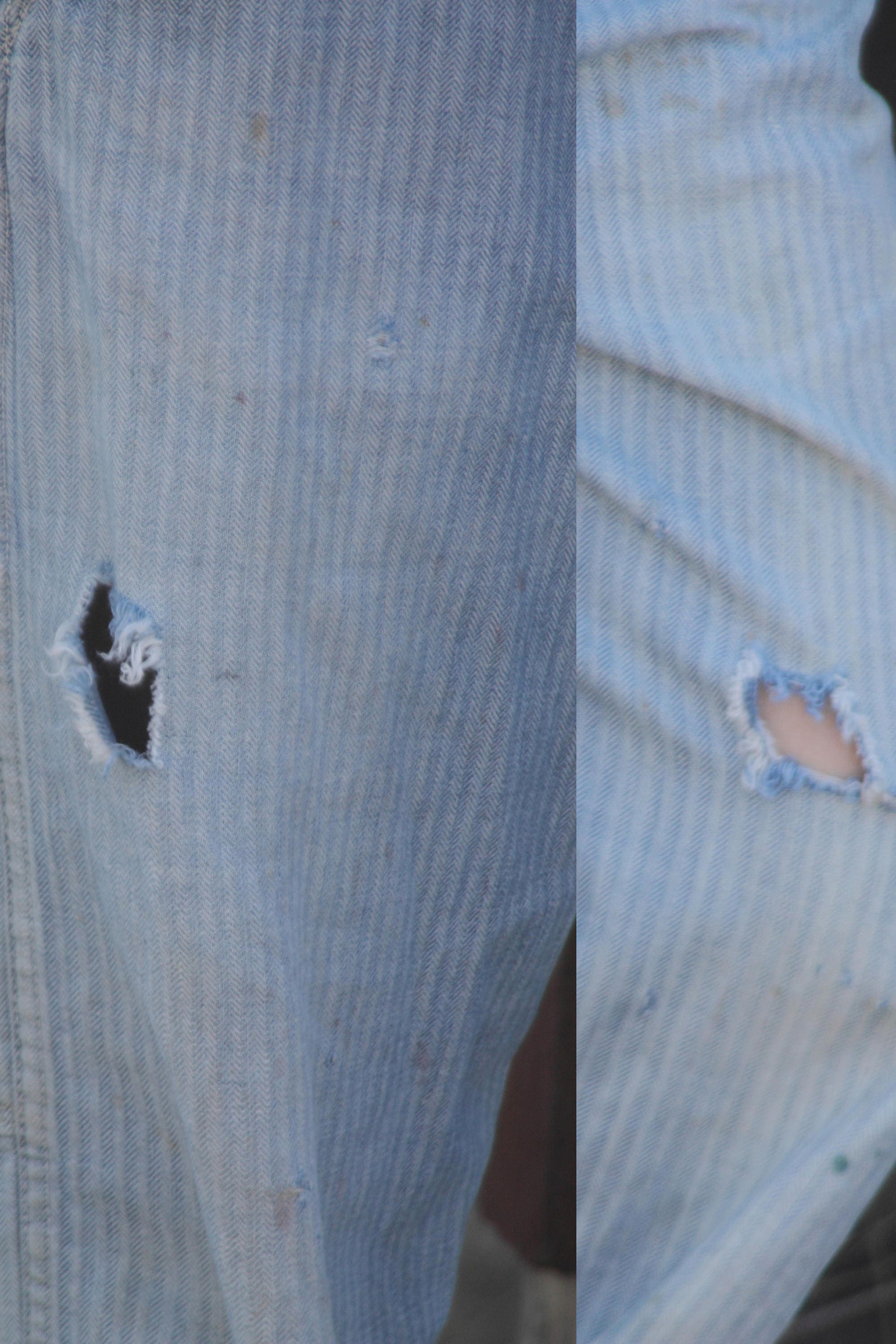 Condition - These are in well used condition with holes in both legs and the crotch area and some soiling that is too be expected from being worn daily on a working farm. They come to you in ready-to-wear condition.