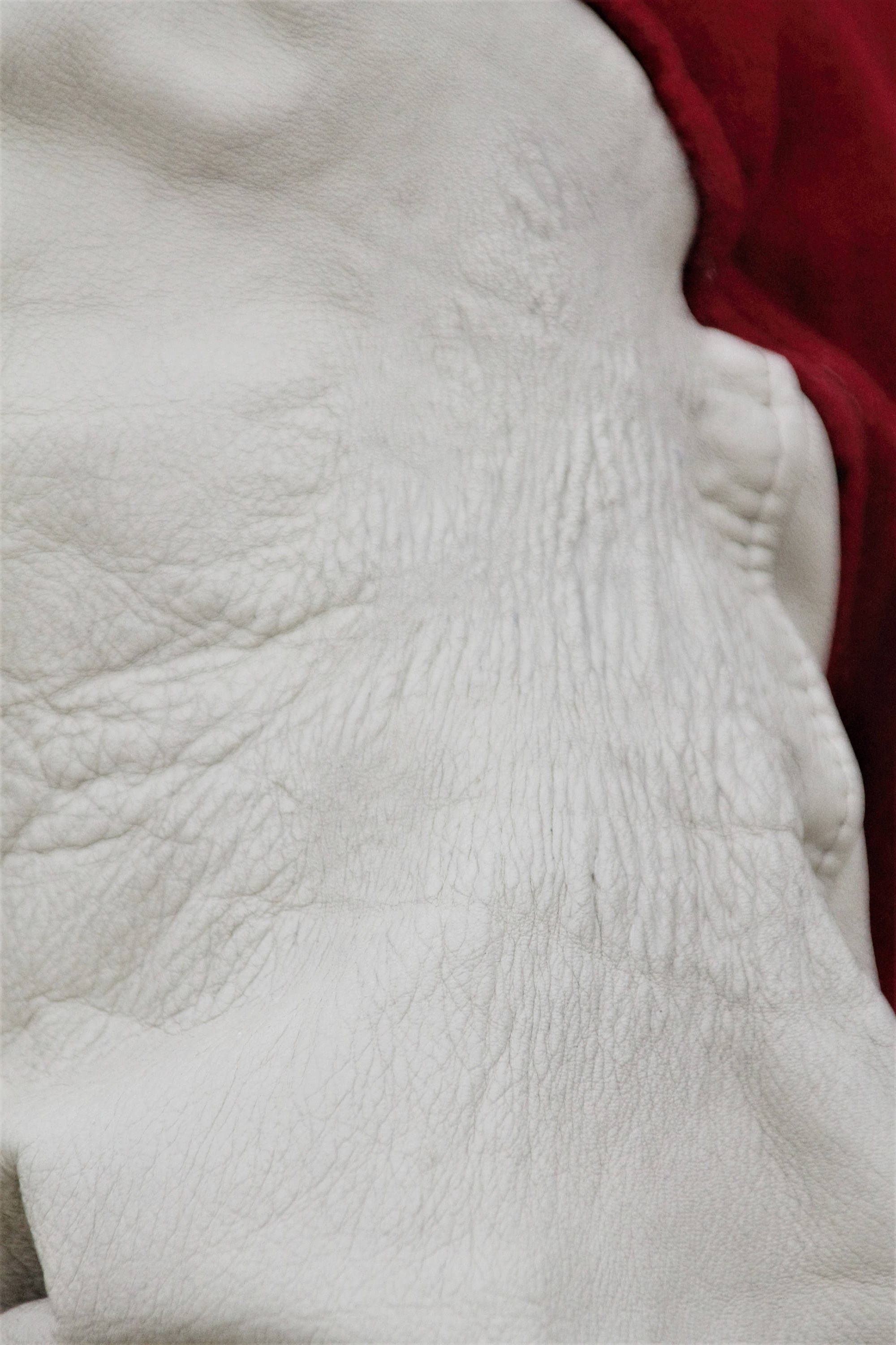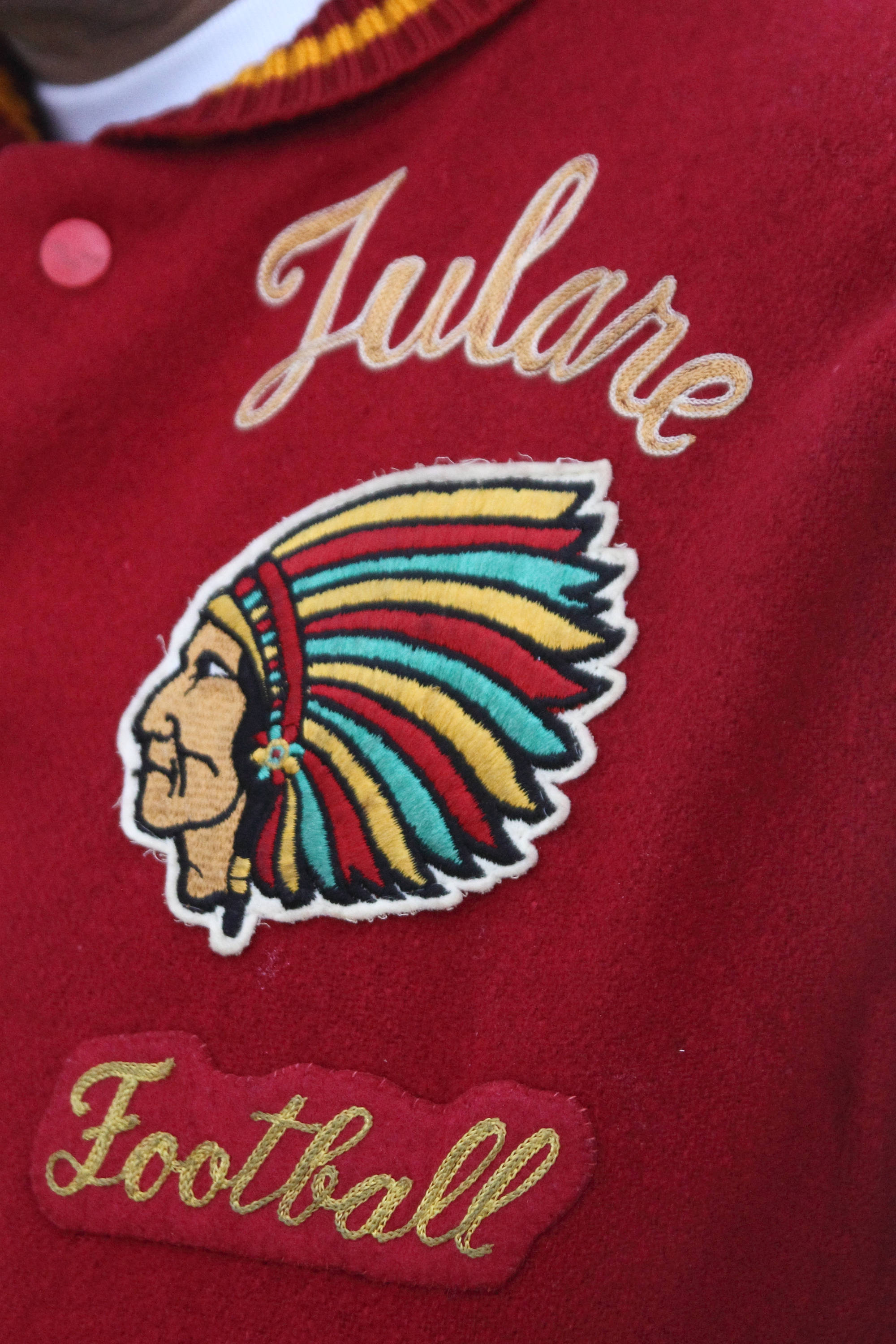 Design - This is great 1950s two tone varsity jacket made from maroon or red wool with with white leather arms and red and yellow ribbing. It's best feature is the original indian head patch with its colorful war bonnet. Also embroidered on the jacket is the name of the high school, Tulare, and the sport, football, both done in yellow. The two slash pockets in the front are also trimmed with the white leather. The jacket also features a ribbed red and yellow shawl collar, Whiting Los Angeles on the red snap buttons and grey lining.