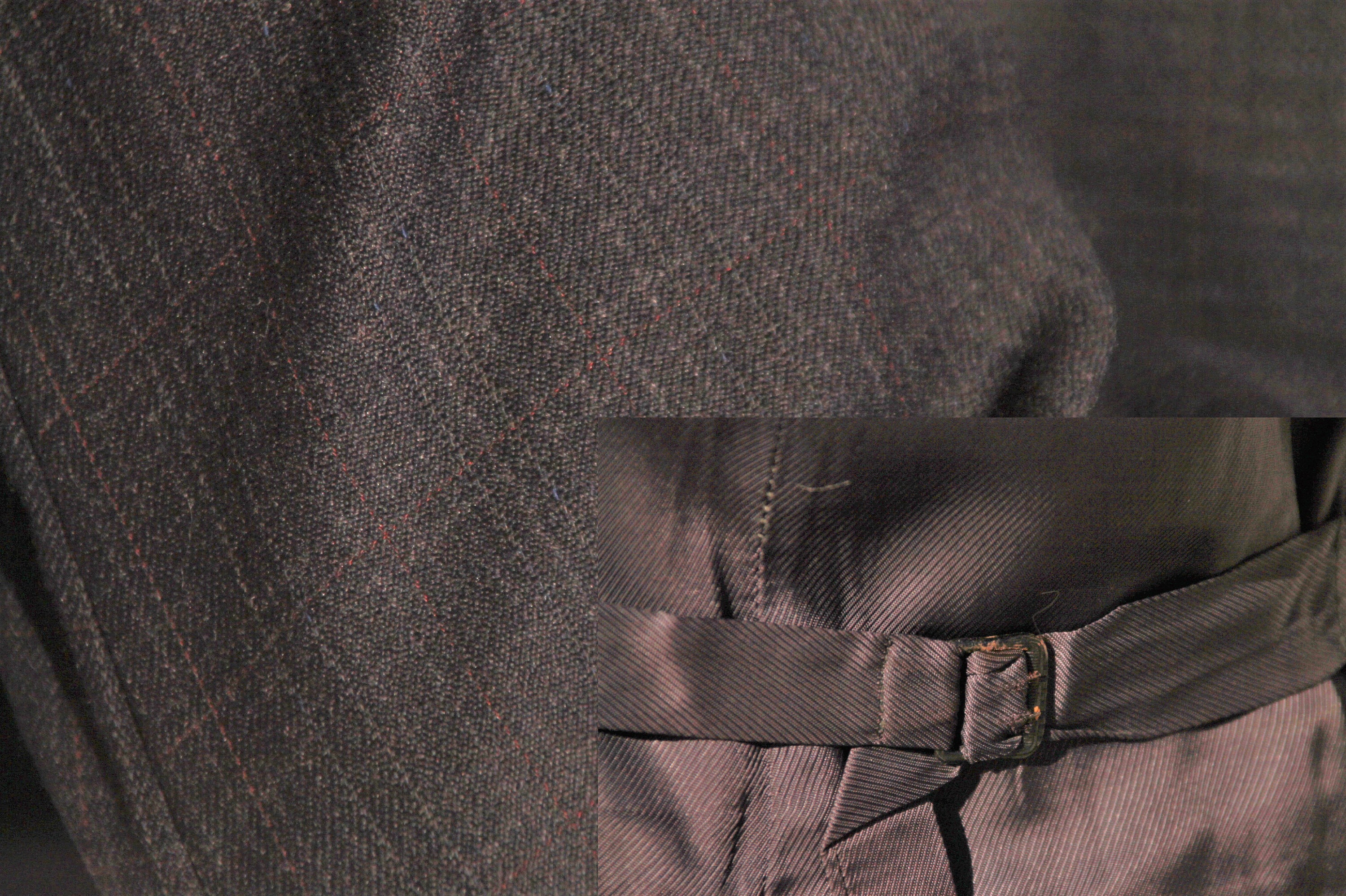 Design - This is an absolutely fantastic 1930's three-piece suit in a beautiful rich navy blue wool with a small, ghostly grey windowpane patterning throughout and slight lines of red (this can be seen in the last photo) The jacket is double breasted with three patch pockets, with pleats on the bottom two. It is belted in the back with a center arrow vent and two small pleats on each side. It also has a three button cuff and french seams on the inside construction. the vest is also belted in the back with Deco patterning on the buckle. The pants are high waisted, creased, wide legged, have faux bone buttons for the button fly and suspenders and are cuffed (these pants have a very long inseam so the cuff is rolled under for the photos) A true Dreem suit!