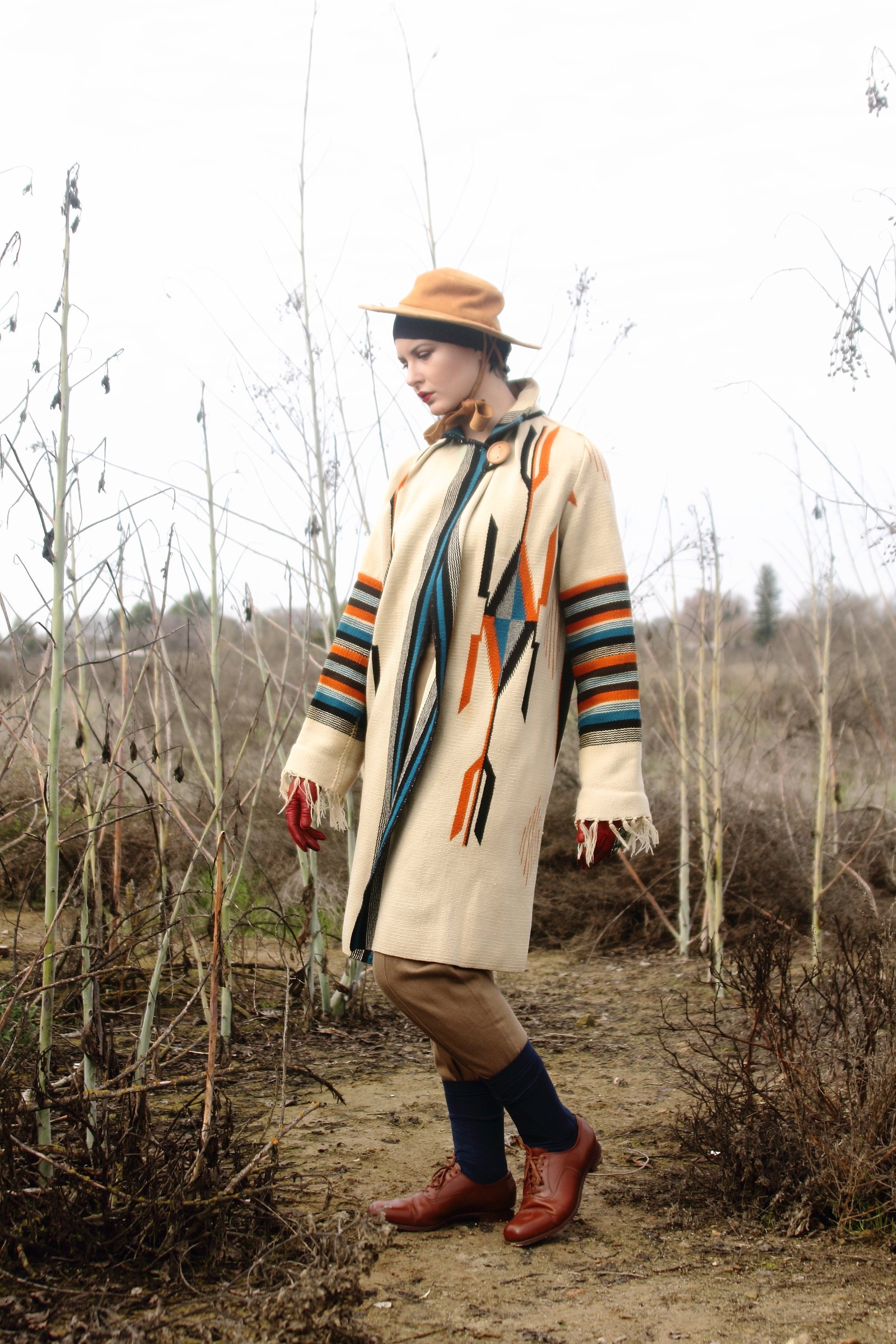 This particular jacket from the 1940's features exquisite patterning throughout, but it is the back piece that really steals the show. A large, wooden button is the only closure on the coat, giving it a fantastic a-line fit, with so much style. As this was literally made from an original rug weaving (early designs were cut up and sewn together) there is a flutter of fringe on the ends of each raglan sleeve. Probably the best element of this particular weave and coat are the use of color, using a cerulean blue, pumpkin orange, dark chocolate brown, black and just a touch of cloudy sky grey, remembering that all original Chimayo wool was dyed using natural dyes. This combination of colors really stands out, with the pattern holding strong to the eye from far away. As previously stated, these pieces are Art.