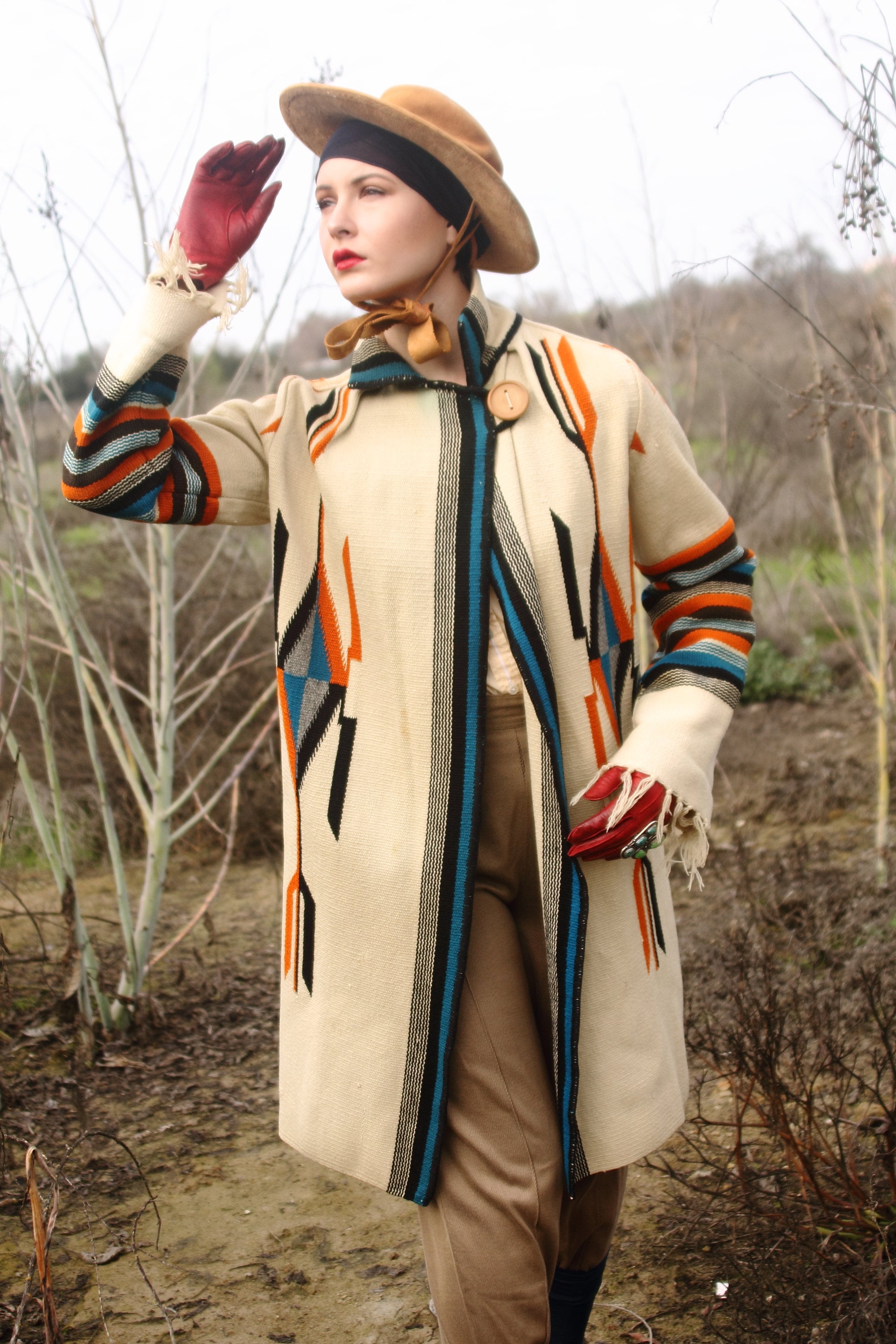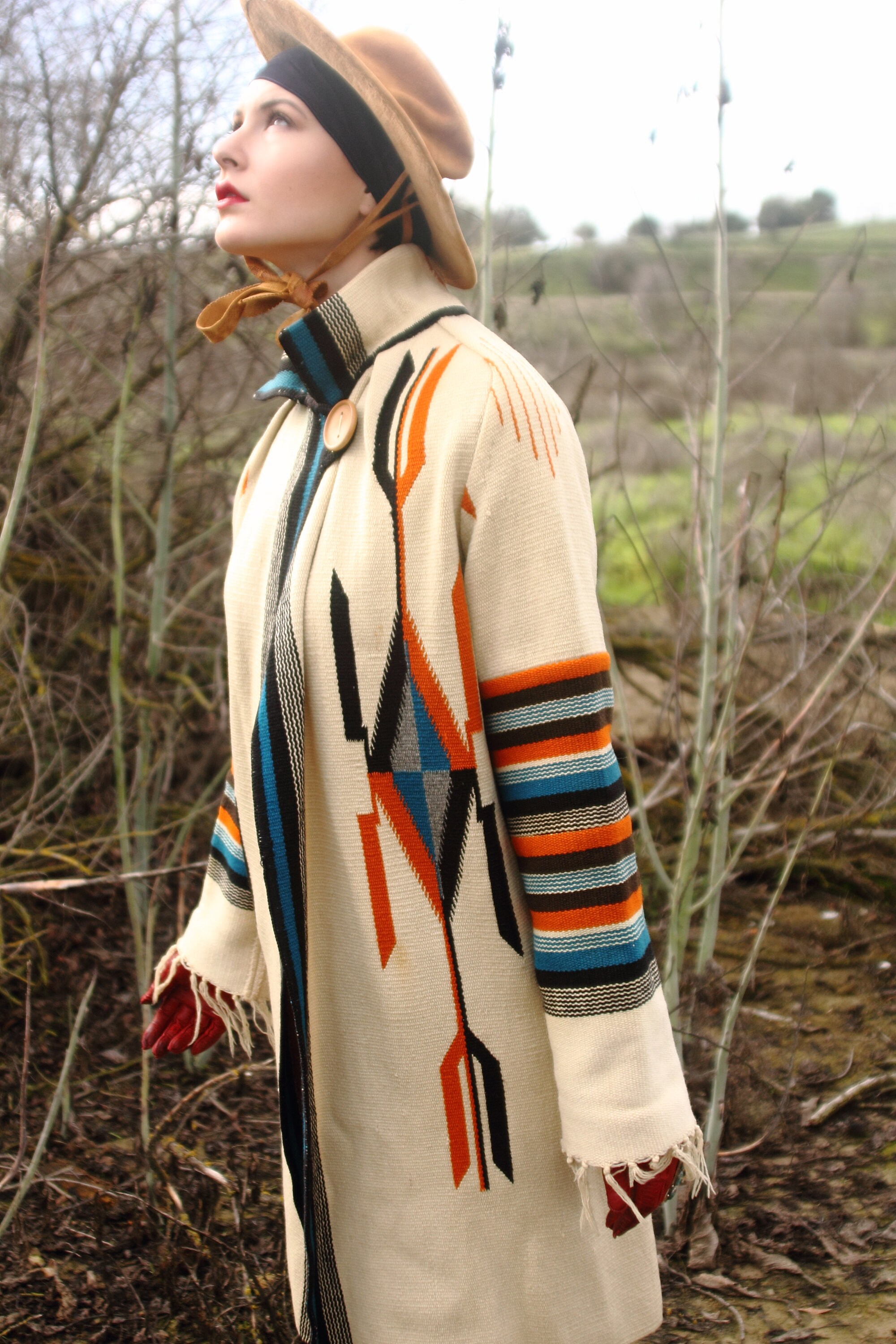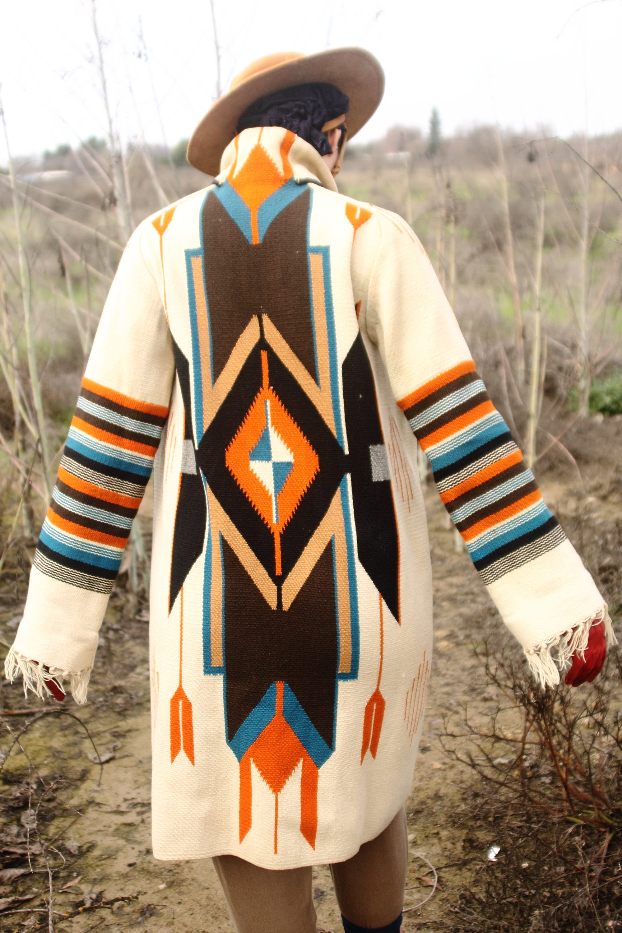 Design - Here we have a stunning original Chimayo coat from the 1940s. For those who don't know, Chimayo weavers have been weaving beautiful blankets for literally hundreds of years in Northern New Mexico, with a concentration around Chimayo, New Mexico. Many think of the Ortega line of weavers when it comes to the apparel that was being created from the blankets in the 1800s, but there are many lines of traditional Chimayo weavers. When you are wearing a piece made from a Chimayo weaver you are literally wearing, not just history, but art history.