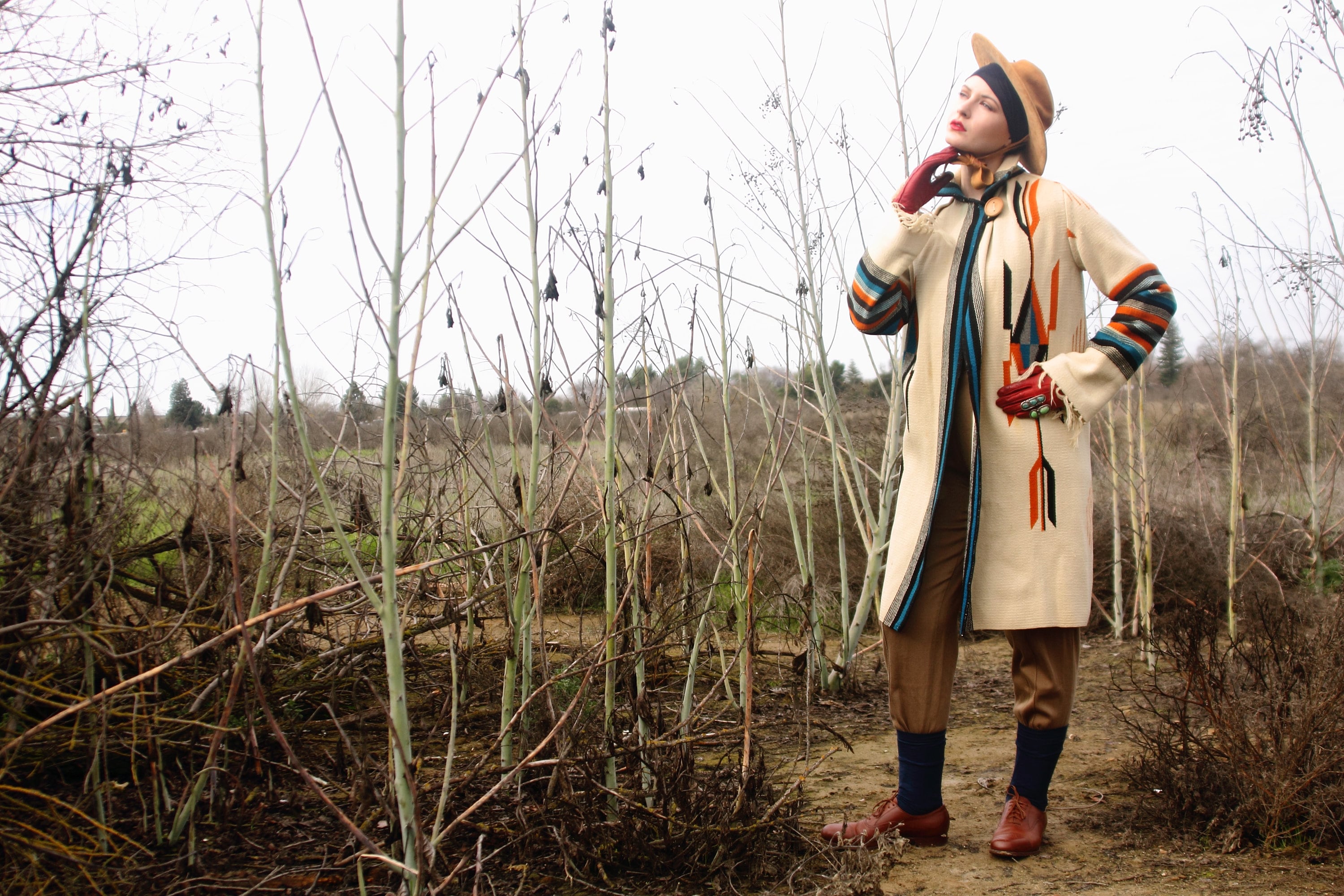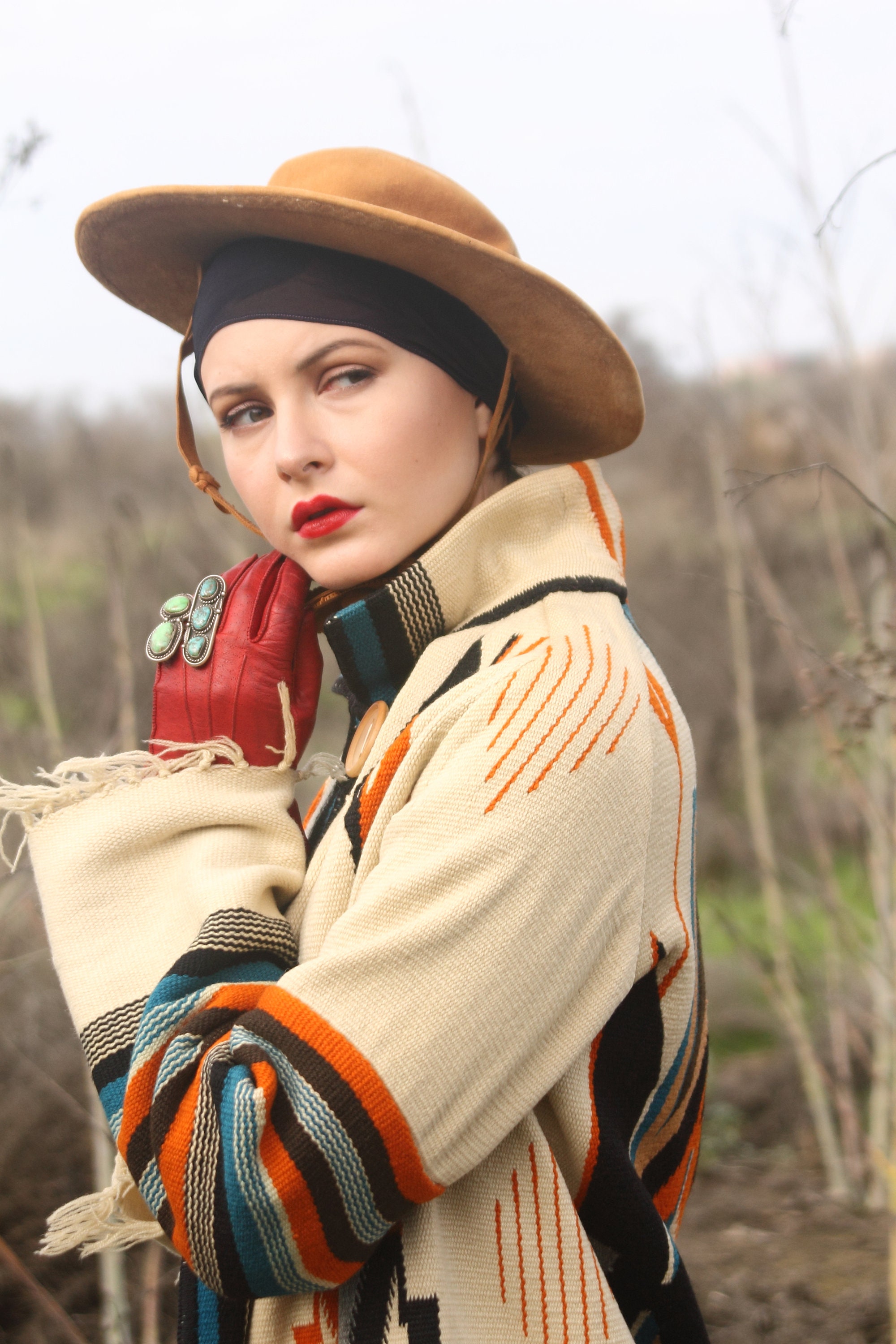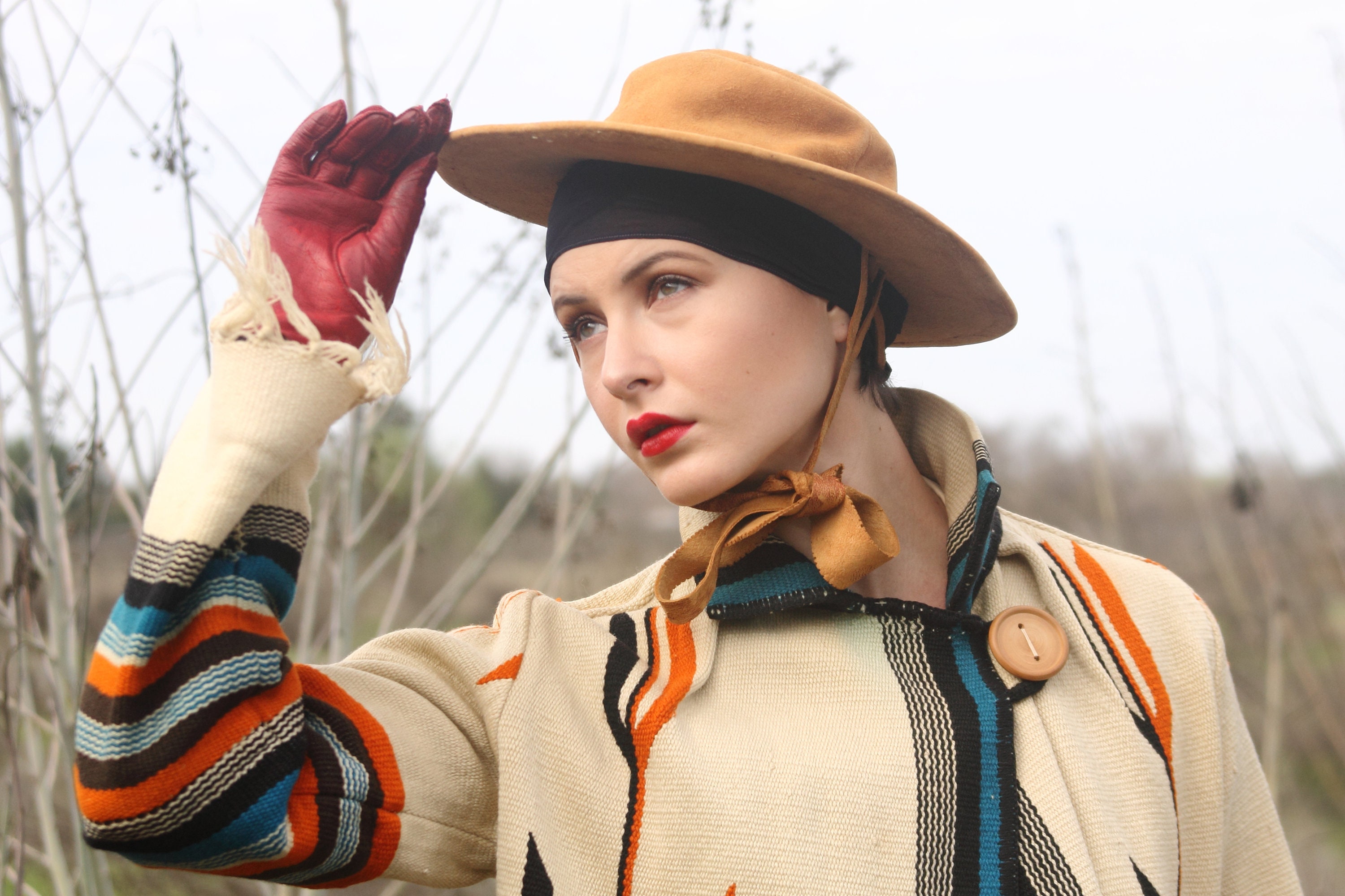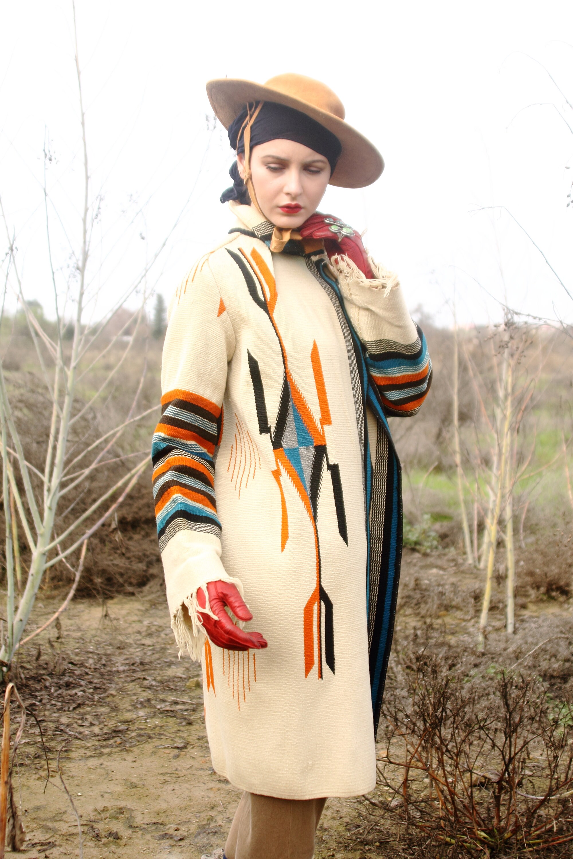 Design - Here we have a stunning original Chimayo coat from the 1940s. For those who don't know, Chimayo weavers have been weaving beautiful blankets for literally hundreds of years in Northern New Mexico, with a concentration around Chimayo, New Mexico. Many think of the Ortega line of weavers when it comes to the apparel that was being created from the blankets in the 1800s, but there are many lines of traditional Chimayo weavers. When you are wearing a piece made from a Chimayo weaver you are literally wearing, not just history, but art history.