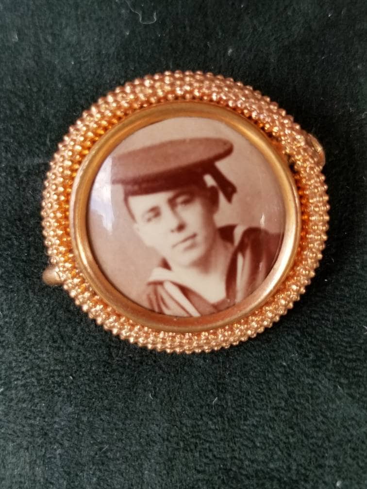 Design - Here we have a beautiful example of an early 1900s mourning brooch with texturized patterning around the frame. The man in the photo is a merchant marine, now lost at sea, but still dreaming of thee.