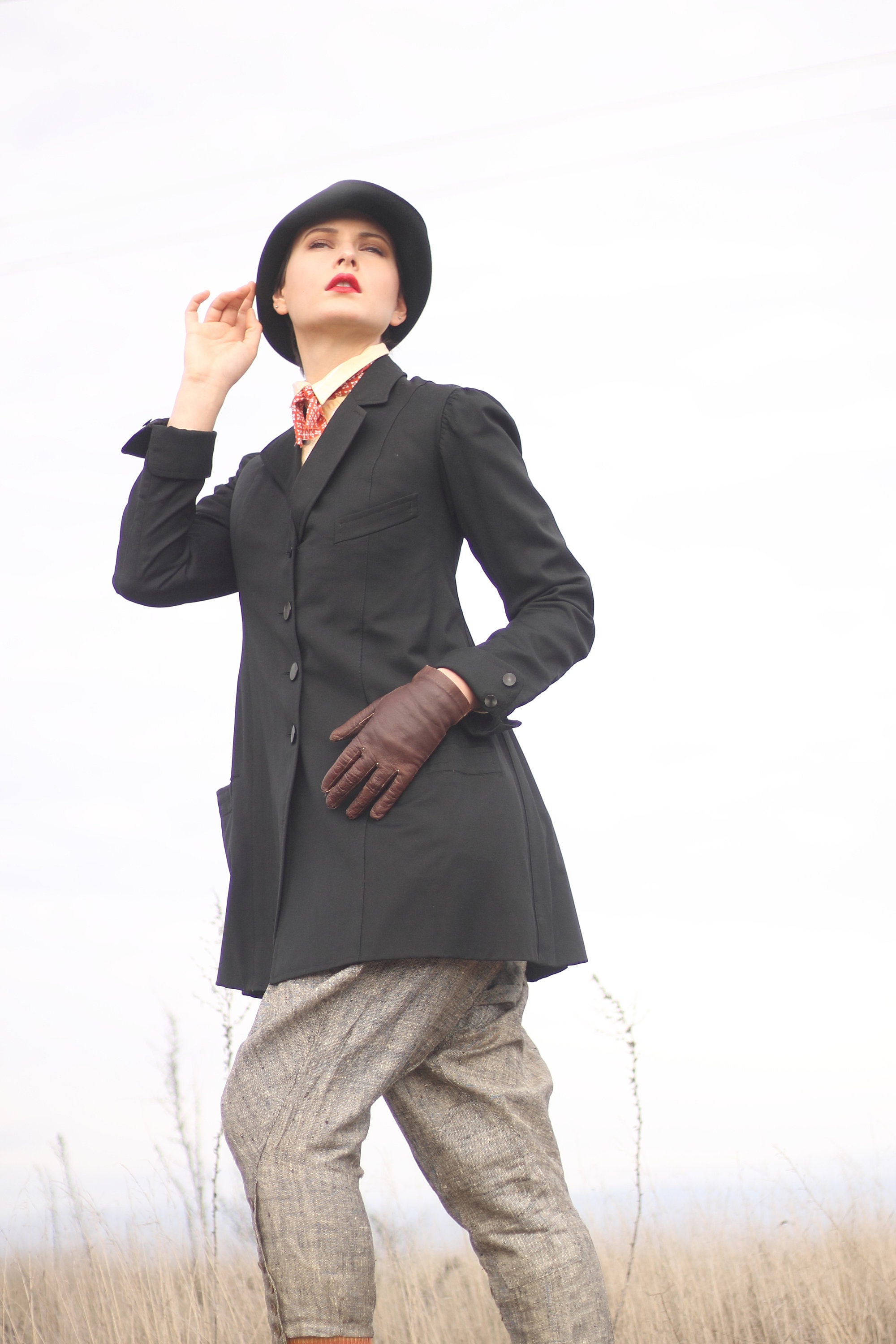 The jacket features the classic A line design, where it is fitted in the shoulders, chest and arms and gradually flares out as it lengthens. This was too accommodate the wide jodhpurs and to be able to ride with some movement. The collar is a notch lapel, there is an exquisite gathering at the shoulder seams, vented back, two front waist pockets and one slant breast pocket, with four buttons up the front and two buttons on the cuffs. It was also tailored with a padding, similar to a slight shoulder pad along the front and back side of the chest, this was a feature sometime used in early riding jackets, although to what end is not clear. It also has a perfect drape due to the weights that are sewn into the jacket hem.
